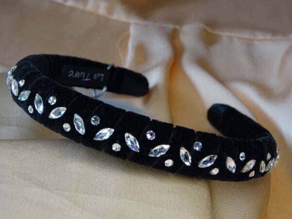 Kадифена тиара с кристали, наредени под формата на цветя, тиарата е тънка и е в любимото на много дами черно. За направата й сме ползвали два вида кристали.