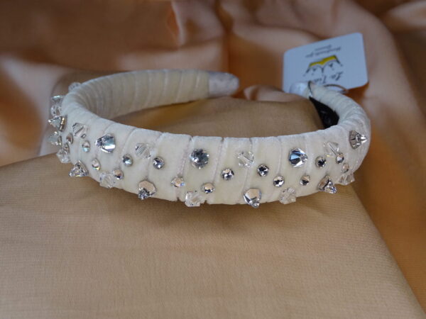 Kадифено бижу в снежно бяло с три вида кристали. Кристалите под форма на пирамиди са най-забележителни, защото създават невероятна визия на тиарата, когато е на главата. Подходяща за булки като всичко по дизайна и материята може да бъде видоизменяно.