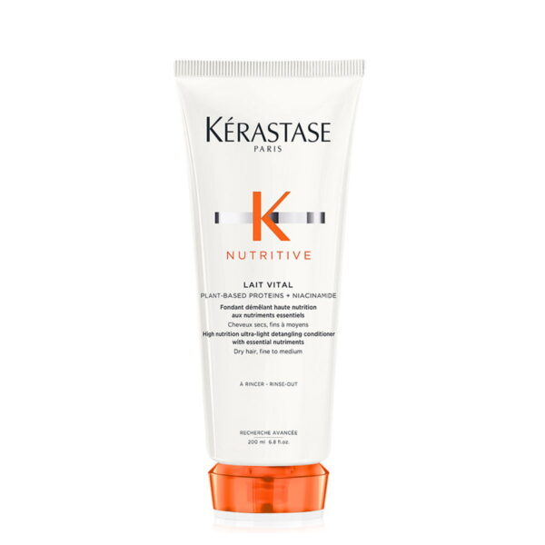 Kerastase Nutritive Lait Vital е ултралек балсам за разплитане за подхранване на косата, обогатен с протеини с растителен произход и ниацинамид. Продукт с бяла гел-крем текстура и мощна формула за суха коса, която хидратира интензивно косъма и го запечатва, за да задържи хидратацията за по-дълго. Действа на косата, без да я утежнява. Подсилва естествената хидролипидна бариера на косъма и го предпазва от външни агресии. Възстановява еластичността на косата и я прави лесна за оформяне.