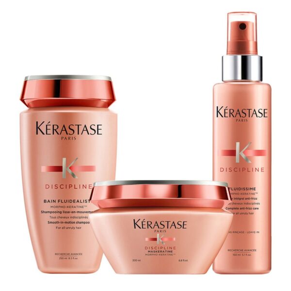Комбинацията от продукти Discipline на Kérastase е предназначена за непокорни коси, които имат нужда от изглаждане, мекота и блясък. Къдравата коса се движи леко и свободно, а правата коса е защитена от фриз ефект, гладка и с блясък.