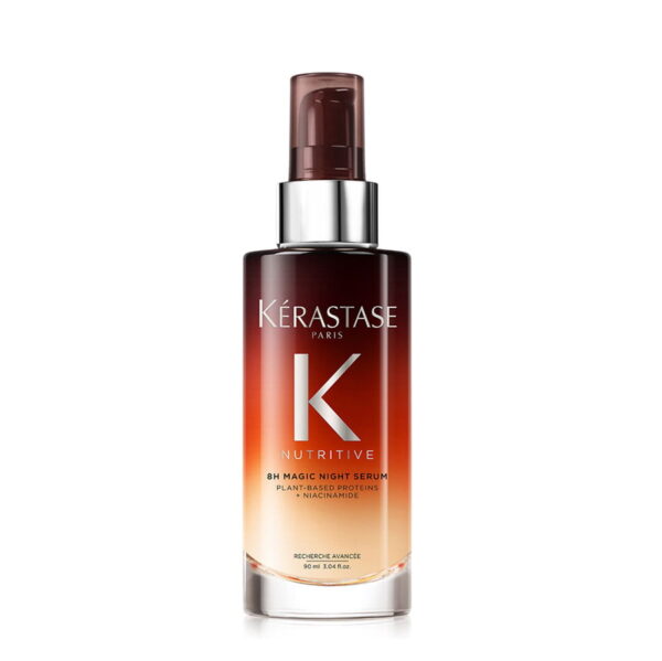 Kerastase Nutritive 8H Magic Night Serum е нощен серум за коса, обогатен с протеини с растителен произход, ниацинамид и глицерин с интензивно подхранващо действие и дълготраен луксозен аромат. Съдържа полимери, които предпазват косата от изсушаване, за моментална грижа с мощно действие. Активните подхранващи съставки в продукта повишават способността на формулата да подхранва и укрепва косата. Магичният нощен серум за коса действа 8 часа, за да регенерира сухата коса.