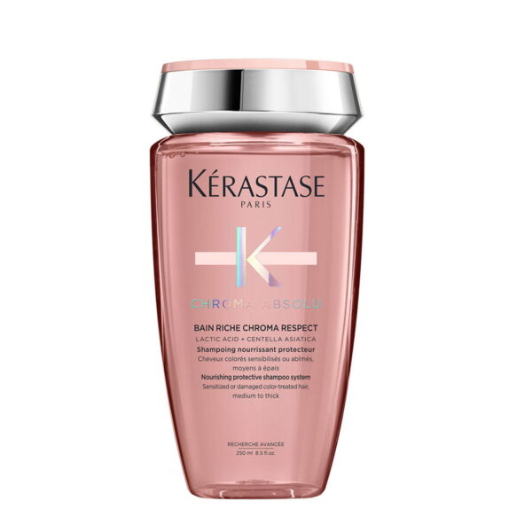 Bain Riche Chroma Respect от серията Chroma Absolu на Kerastase  е подхранващ и предпазващ шампоан за чувствителна или увредена боядисана коса. Подходящ за нормална до плътна коса.