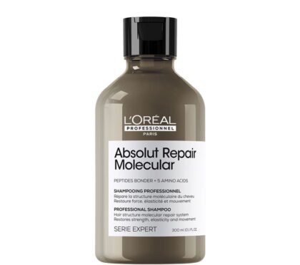 Absolut Repair Molecular на L’Oréal Professionnel е маска без изплакване за увредена коса с бързо абсорбираща се кремообразна текстура и система за защита на пептидните връзки, обогатена с аминокиселини. Осигурява термозащита, подсилва косата и придава блясък. Продуктът е формулиран със система за защита на пептидните връзки и 5 аминокиселини за възстановяване на молекулярната структура на повърхността на косъма*. Леката текстура прониква мигновено и възстановява силата на косата. Косата е с подобрена еластичност и се движи свободно**. Придава лекота, блясък и здрав вид за косата, като я предпазва от външни агресии. Absolut Repair Molecular е серия, предназначена за увредена коса, която възстановява 2 години увреждане на косата след първата употреба***.