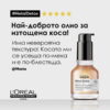 Концентрирано олио, подходящо за изсветлена, боядисана, суха или изтощена коса. Осигурява до 97% по-малко накъсване на косата* и предпазва цвета на боядисаната коса**, за по-дълготраен и сияен цвят.
